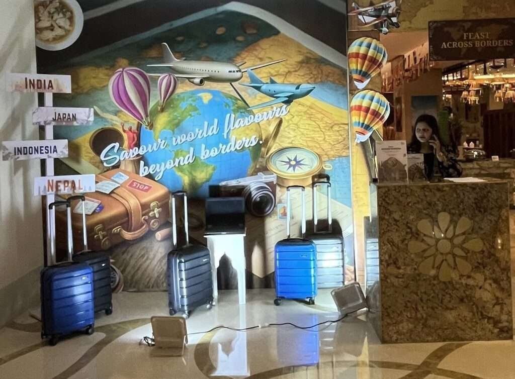 The entrance to Edesia, the festival space, was immediately captivating. Cabin bags were part of the décor, setting the tone for a culinary journey across borders. Guests were handed “passports” to show before entering Edesia — each stamped to mark the start of the experience. Flags and signs representing the countries whose cuisines were on display reinforced the airport-inspired theme, creating an elegant, immersive setup that felt thoughtful yet playful.
