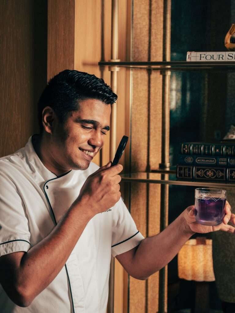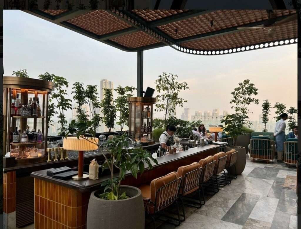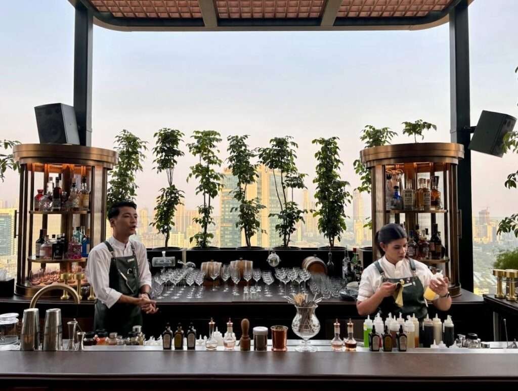 Here, mixology takes center stage under the guidance of Beverage Manager Vineeth Krishnan. Guests are treated to meticulously crafted cocktails featuring fresh botanicals and a curated selection of artisanal spirits from around the world, including the signature AER Gin. Architect Phillip Pond describes the space as having “a cozy urban feeling, like you’re a spectator in this gathering of towers.” Every seat offers a close-up view of the bartenders as they work their magic, turning your drink into a personal story infused with craft and creativity.