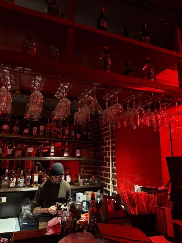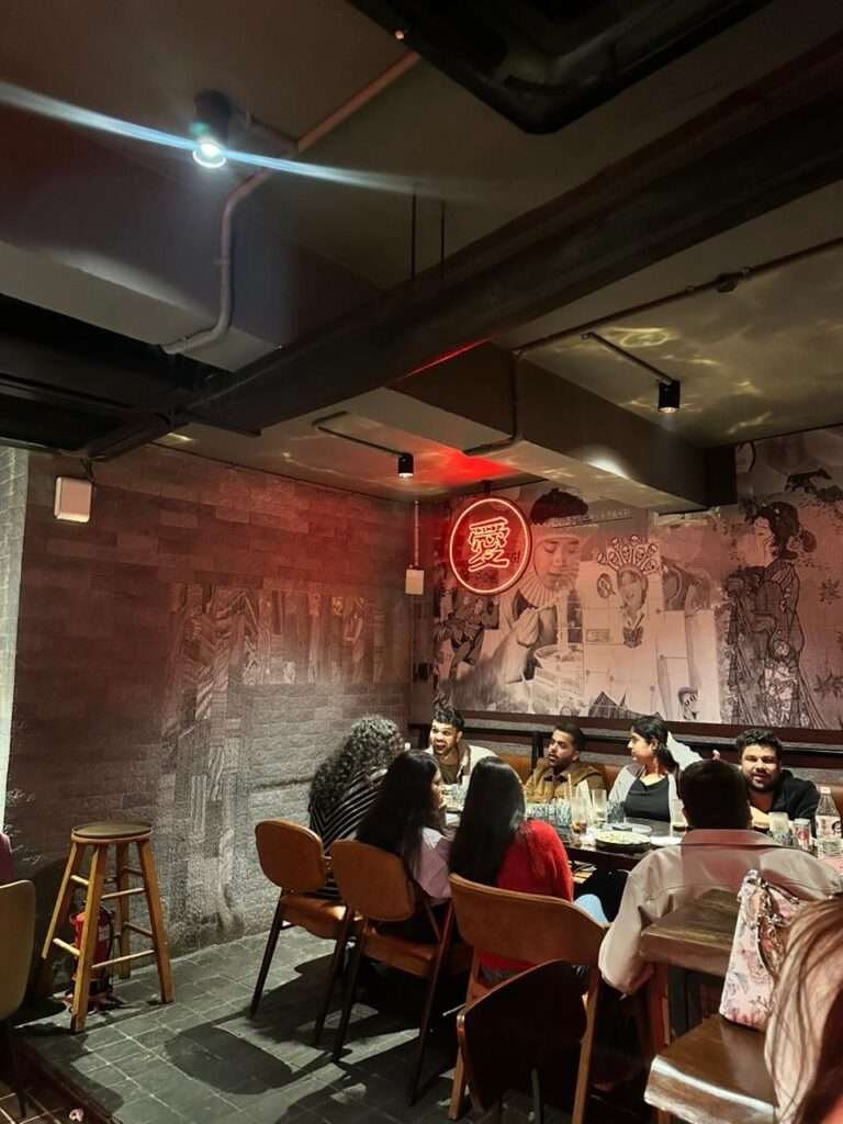 What makes Gonzo Gurgaon especially engaging is how the space reveals different personalities. One section stays true to the grungy, neon-drenched DNA of Gonzo Vasant Vihar, complete with towering walls layered in retro Japanese posters and that familiar, rebellious charm. The other side offers a striking contemporary contrast — polished red tiles, futuristic lighting, and a floating LED strip that bathes the zone in a dramatic glow. It’s a thoughtful design that lets guests choose their mood, whether they’re drawn to raw energy or a sleeker, lounge-style setting.