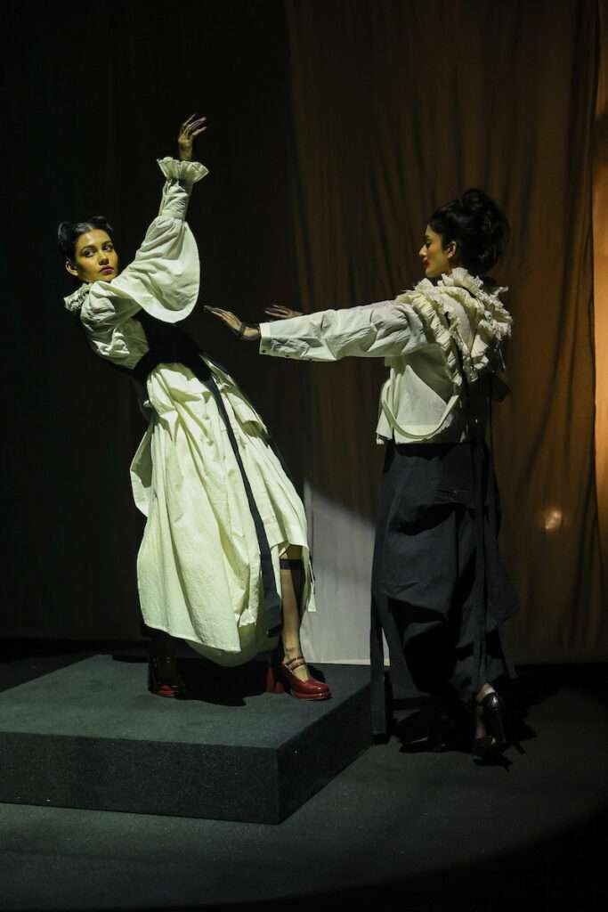 What elevated the presentation further was its performative dimension. Models stepped beyond the predictability of the runway, engaging in a choreography that balanced improvisation with control. Movements oscillated between stillness and release, creating a palpable dialogue between garment and body. It was here that the collection found its most compelling expression—not static, but alive.