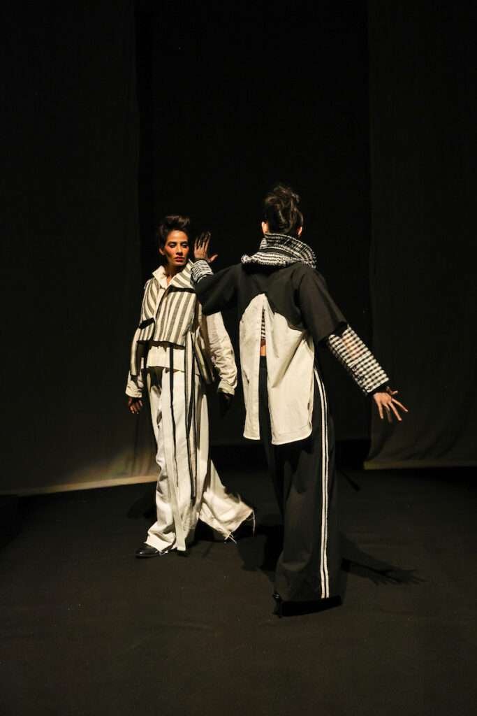 Rather than relying on colour, the collection leaned into the stark vocabulary of black and white, using it not as limitation but as language. Within this restrained palette, designer Sohaya Misra explored the nuanced terrain between opposites—the greys that exist between certainty and ambiguity, strength and vulnerability. The result was a collection that felt less like a visual statement and more like a meditation on perspective.