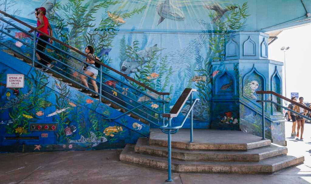 From there, walk to the historic Santa Monica Pier. More than a postcard image, it remains a living part of the city. Pacific Park’s solar-powered Ferris wheel rises above the waterline, while the Santa Monica Pier Aquarium offers a closer look at local marine life.